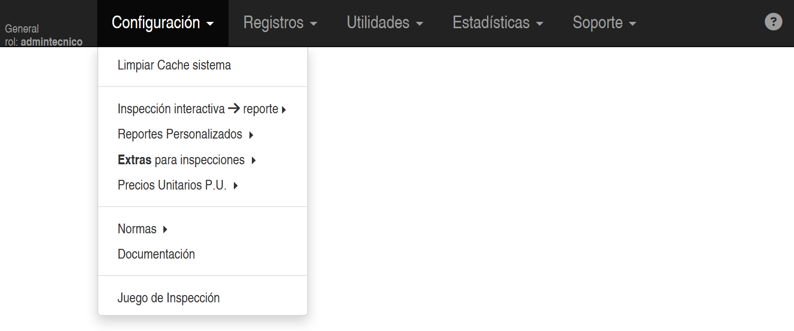 Al seleccionar la opción Menú general/Configuración, se despliega un Menú desplegable con diversas opciones, tal como lo indica la siguiente imagen.