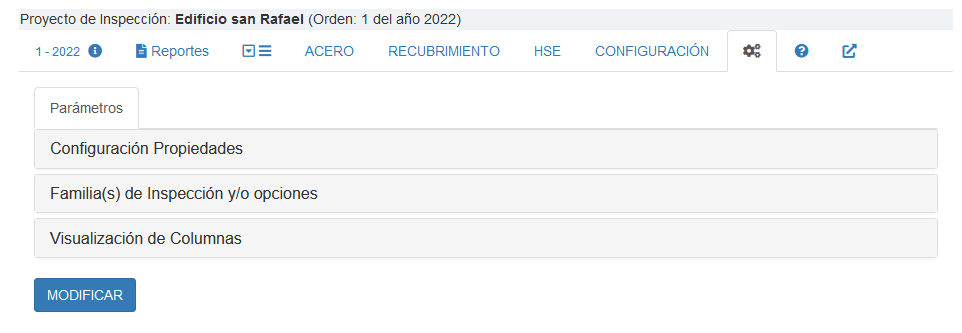 ) se activa un segundo nivel de pestañas que permiten la configuración de varios ajustes de este proyecto de Inspección.