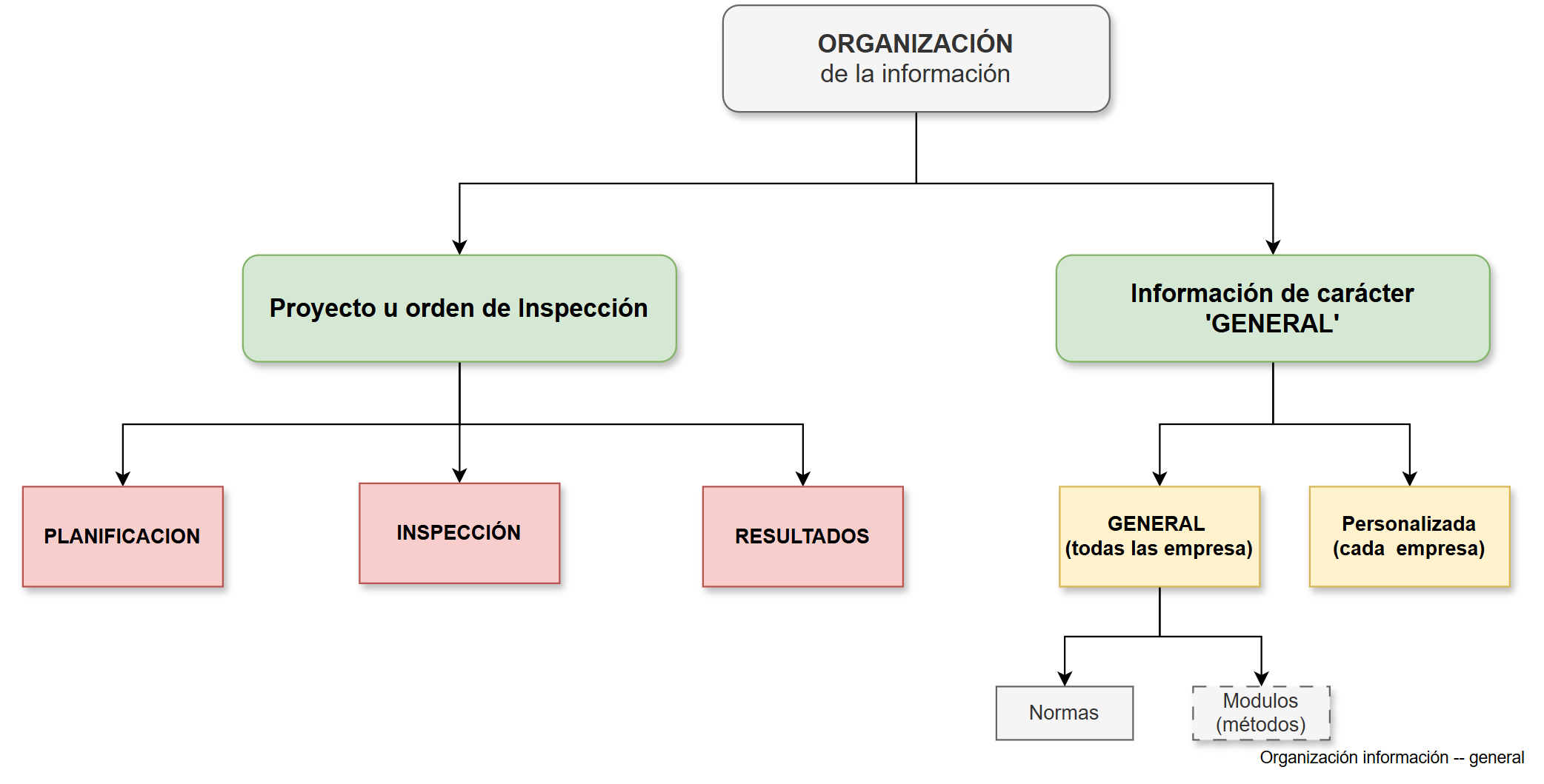 - Información de relacionada con un proyecto u orden de inspección, cuya información es específica del proyecto. Esta información se puede simplificar en Información de Planificación (actividades previas a la inspección, pero la determinan), la Inspección propiamente como tal y la presentación de los Resultados