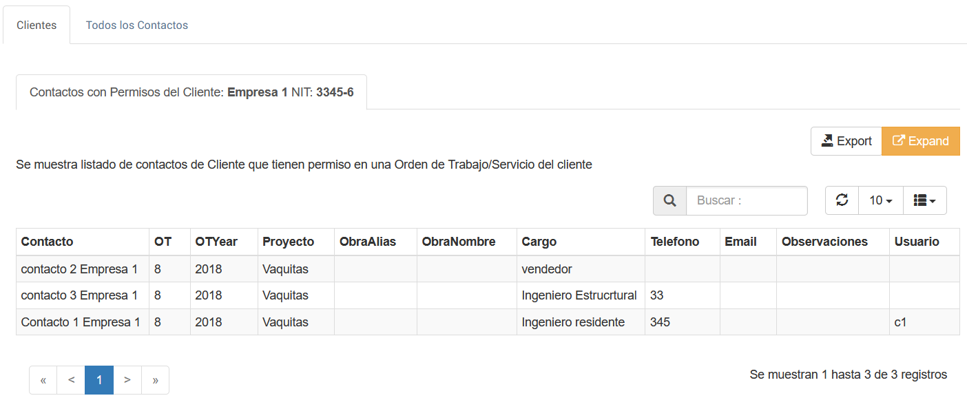 En esta opción se visualiza en la pestaña el nombre y NIT del Cliente y una tabla de datos con contactos y permisos asociados de acuerdo a las Ordenes que este cliente tenga.