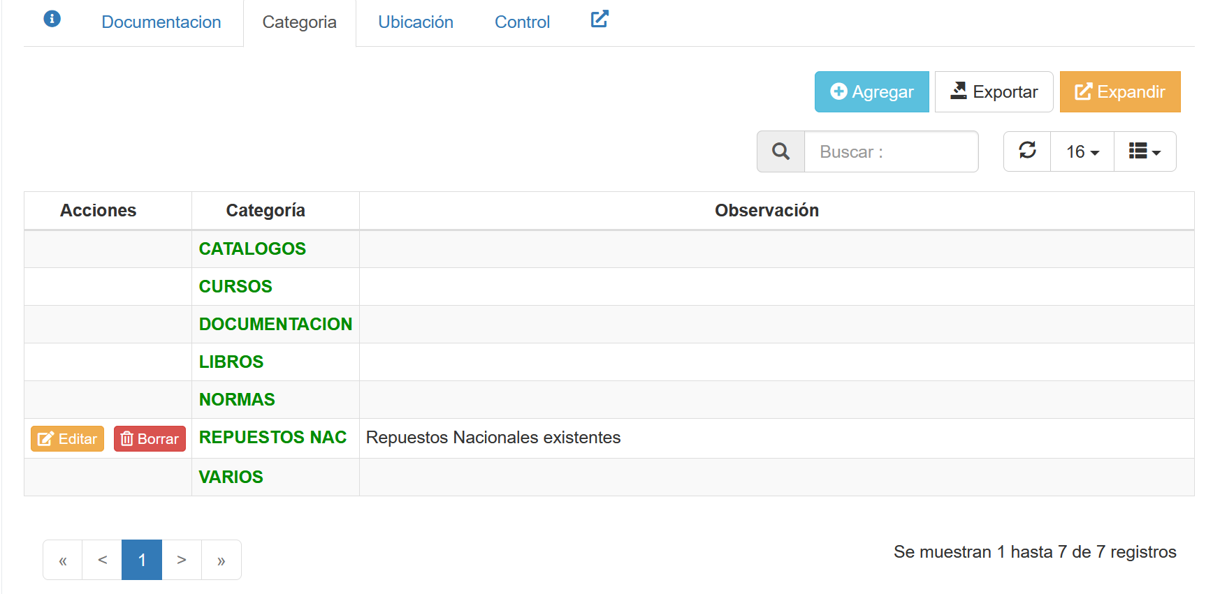 Pestaña Categoria Menú Herramientas/Menú Configuración/Opción Configuración/Documentación/Pestaña Categorías. Al seleccionar esta pestaña, aparecerá una pantalla tal como se muestra a continuación. Fig 492 Extracto de pantalla, con listado de Categorías.