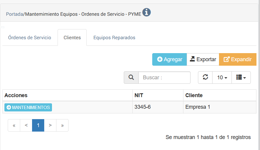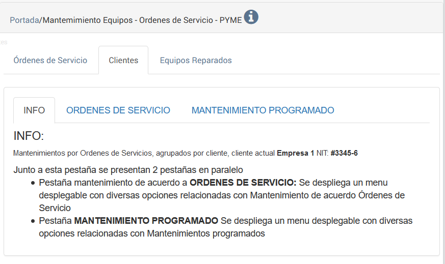 e-MMCC/ Mantenimiento de Equipos/ Orden de Servicio Pyme/ Pestaña Clientes