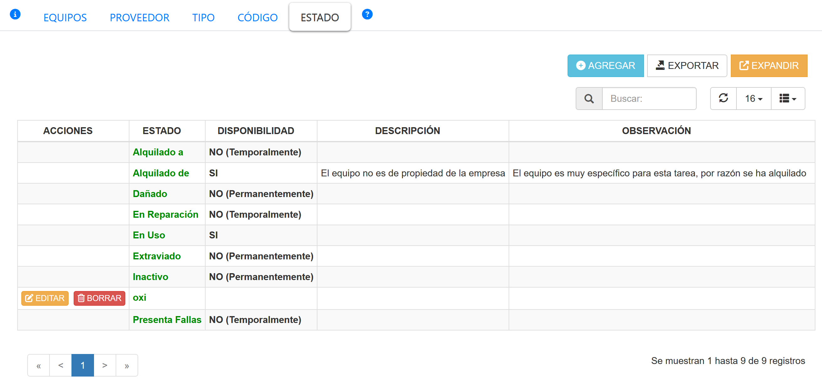 Esta opción permite definir Estados de equipos, como complemento de información para Equipos de inspección.Tal como se muestra en la siguiente imagen.