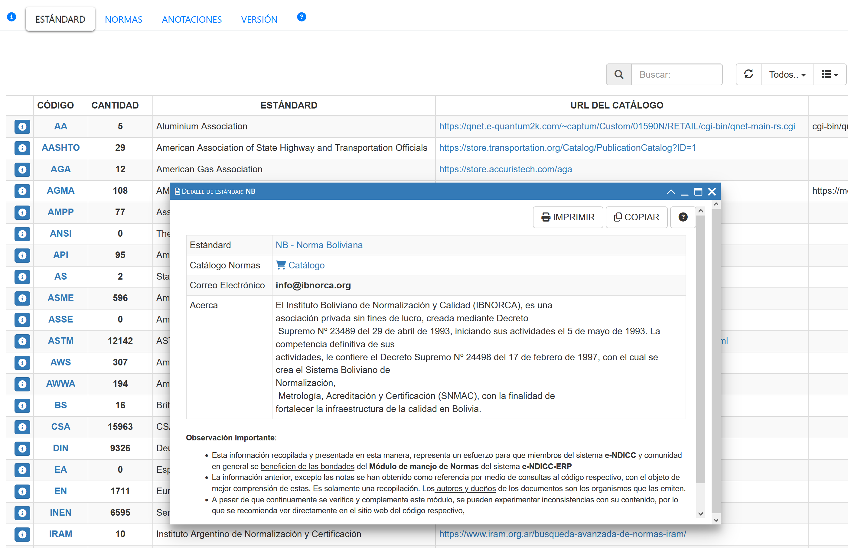 Fig 1159 Extracto de pantalla con listado de estándares u organizaciones con ventana de detalle