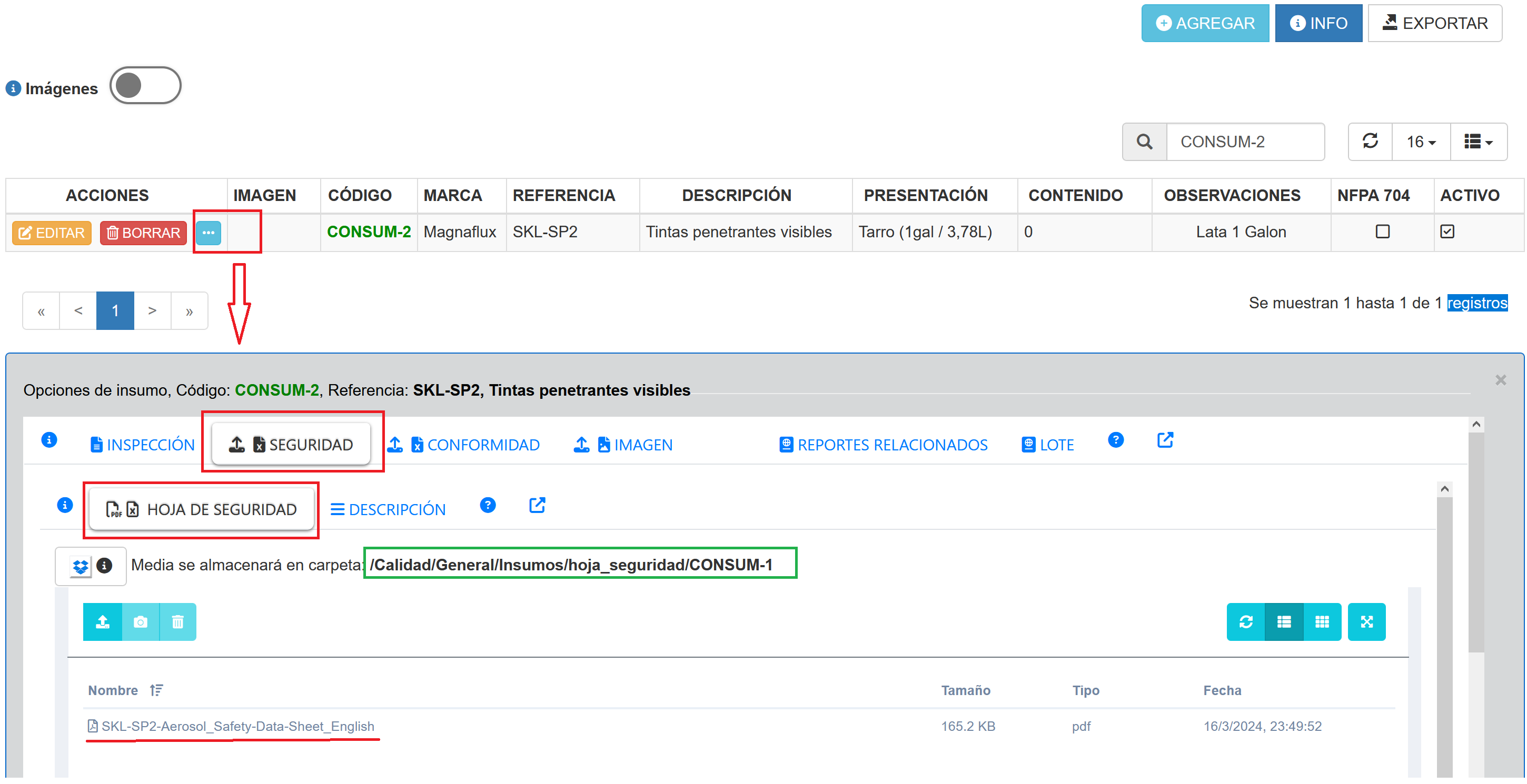 - HOJA DE SEGURIDAD: Permite cargar la hoja de seguridad directamente en medio remoto en una carpeta definida por el insumo. Se recomienda usar un formato PDF