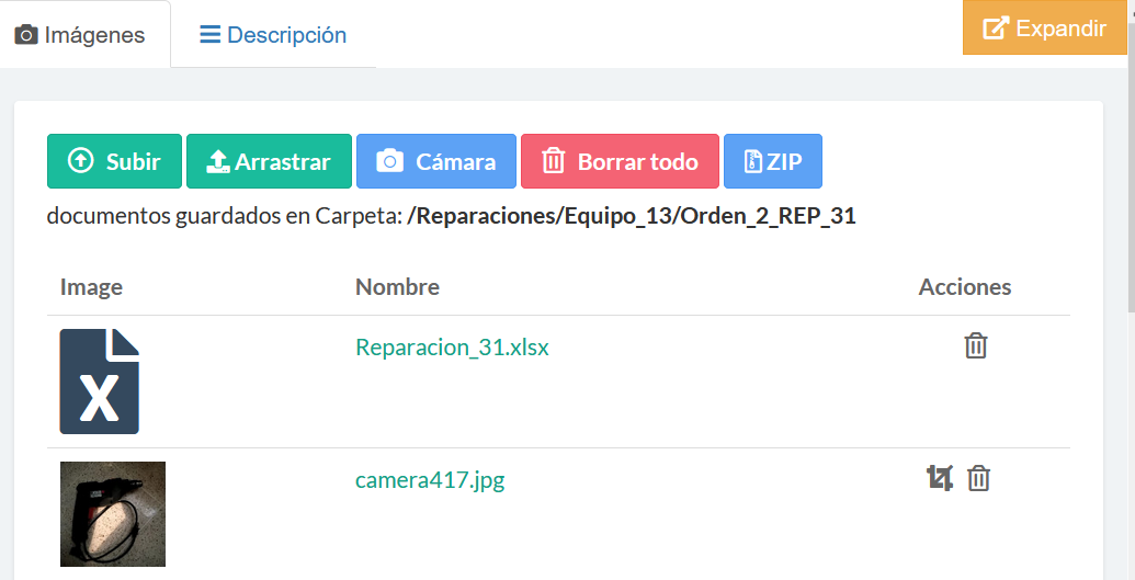Aquellos archivos que son cargados en el servidor aparecerán en el listado de archivos luego de los botones. Ver más detalles Listado de Imágenes/archivos