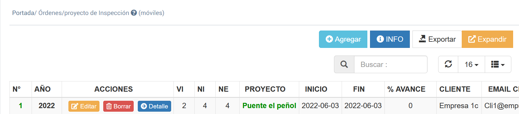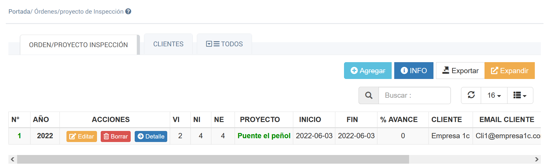 Pestaña Ordenes/Proyectos de Inspección