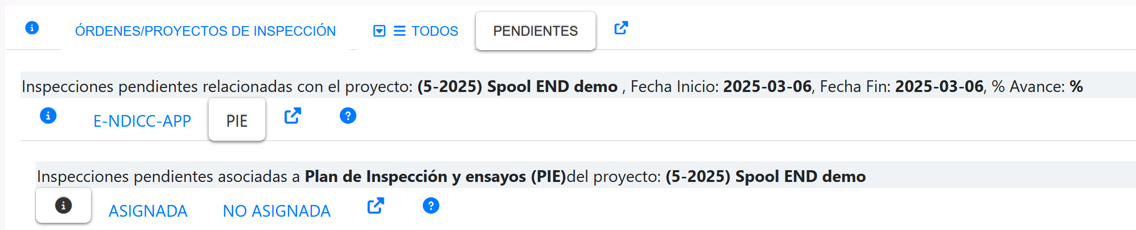 Al presionar la pestaña PIE (Plan de Inspección y ensayos) de la página de Pendientes se muestra un segundo nivel de pestañas, tal como se muestra en la siguiente imagen.