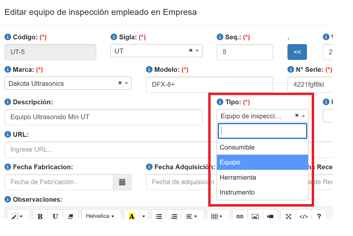 La definición de Tipos de equipo es empleada cuando se define un nuevo equipo para inspección, simplemente se selecciona de uno de los definidos, tal como se aprecia en la siguiente imagen.