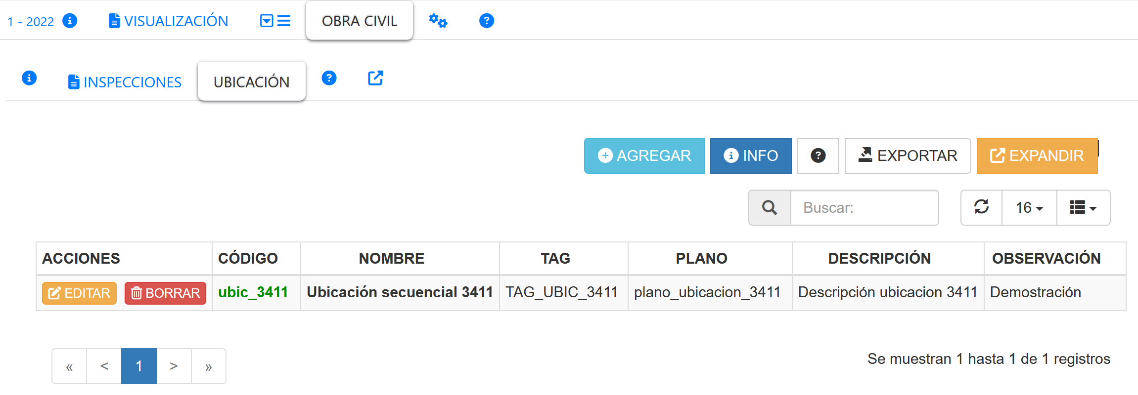 Al seleccionar la pestaña UBICACIÓN, se mostrará un listado de ubicaciones definidos en el sistema e-NDICC para esta empresa, tal como se muestra en la siguiente imagen