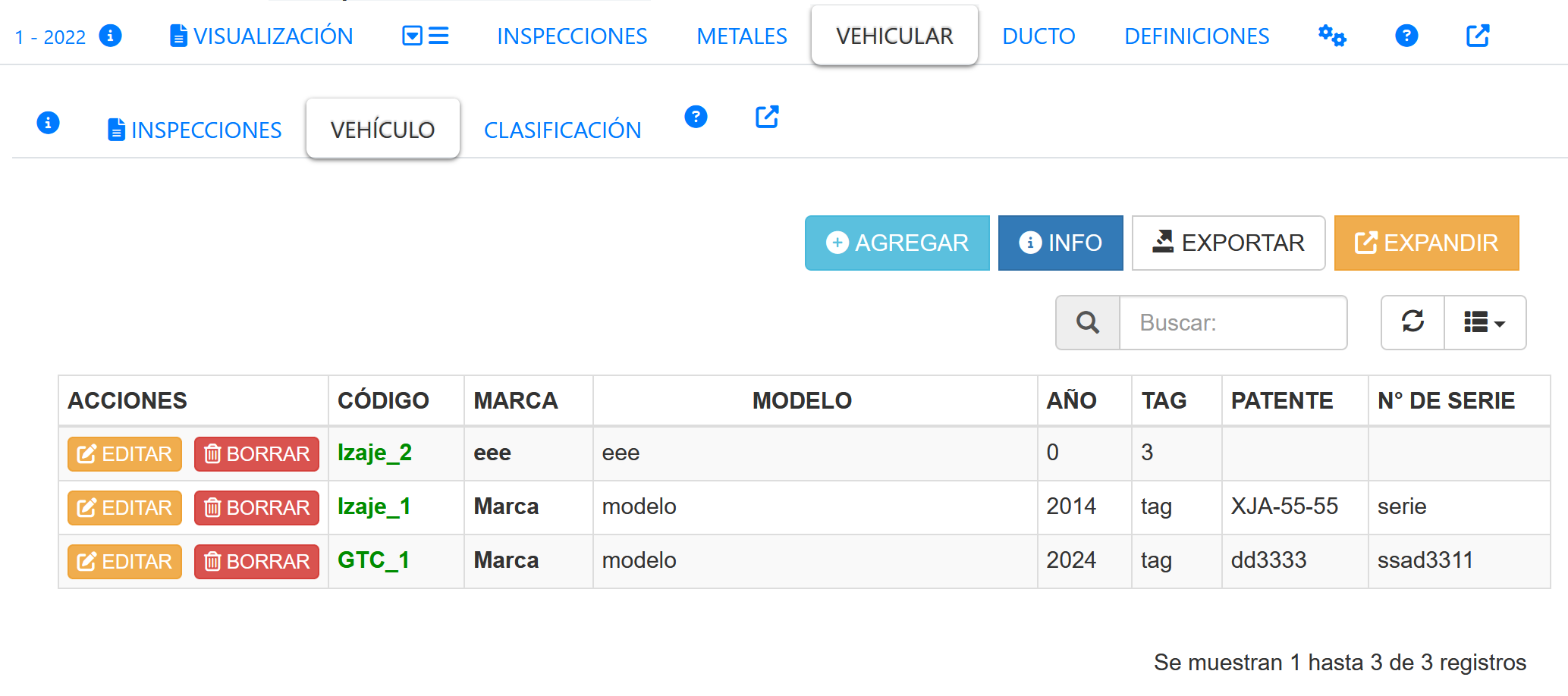 Fig 343 Extracto pantalla con listado de Vehículos definidos en sistema