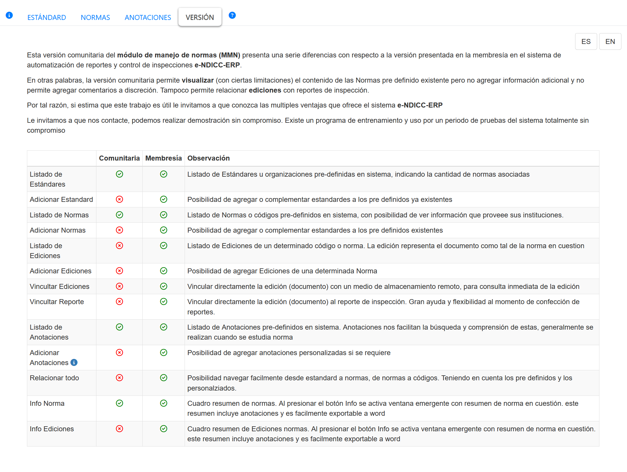 Pestaña Versión Al seleccionar la pestaña VERSIÓN, se activará una pantalla que muestra un listado de estándares u organizaciones definidos en el sistema e-NDICC-ERP tal como se muestra en la siguiente imagen. Fig 1162 Extracto de pantalla de opción versión
