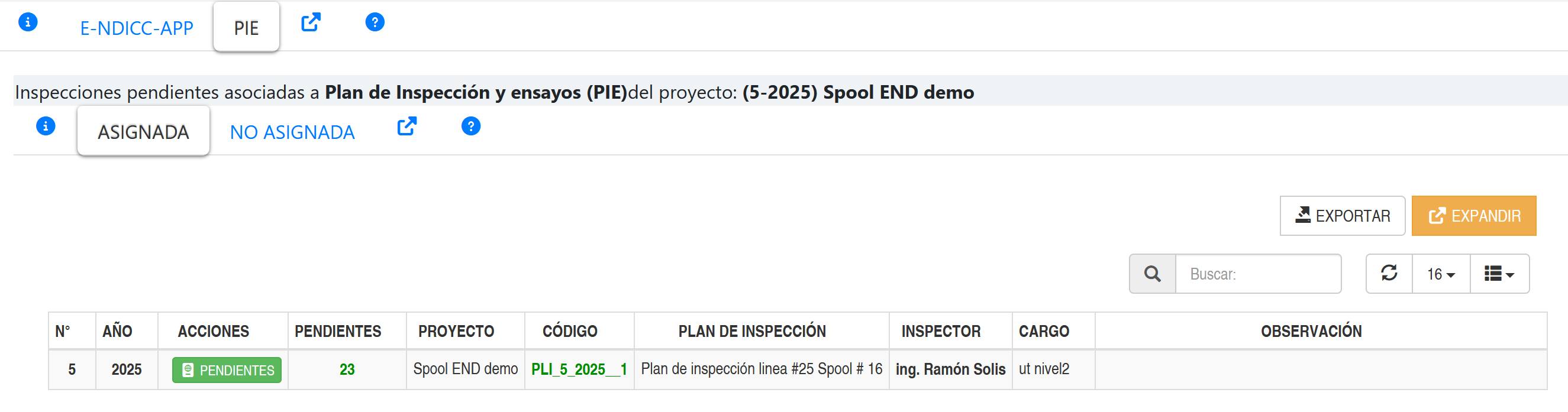 Al presionar la pestaña Asignadas de la pestaña PIE (Plan de Inspección y ensayos) se mostrará un listado de inspecciones disponibles que han sido asignadas a un inspector, tal como se muestra en la siguiente imagen.