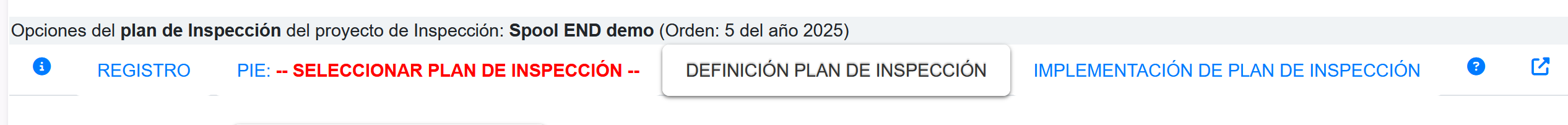Una vez que se ha seleccionado el botón Ir al plan de Inspección, el usuario se enfrenta con una nueva pantalla que posee las opciones de menú para trabajar con el plan de Inspección, tal como se muestra en la siguiente imagen.