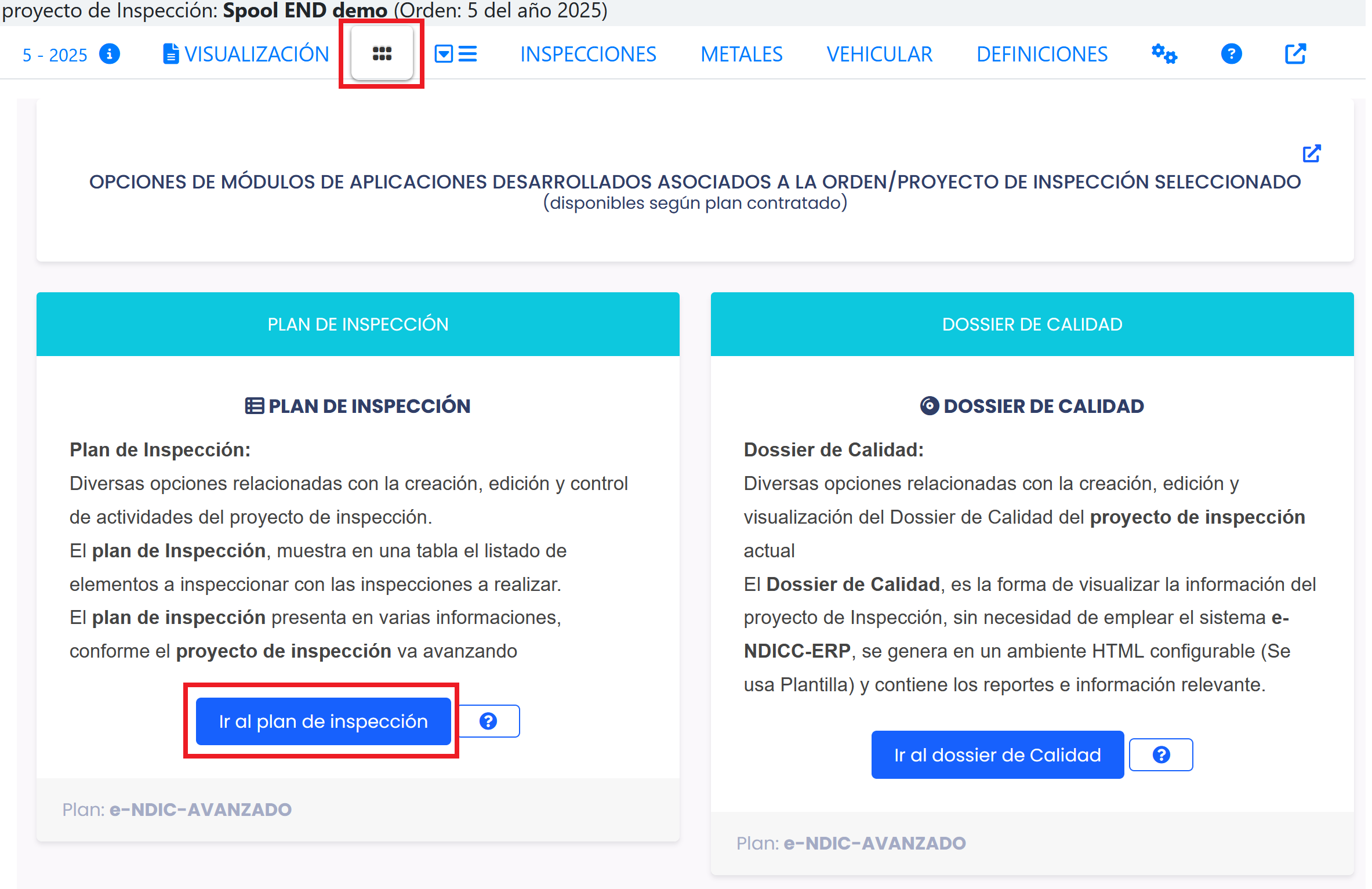 Se accede al plan de Inspección y ensayos (PIE) desde cada Orden/Proyecto de inspección (Cada orden puede contener uno o varios planes de inspección). Para ello, es necesario seleccionar los botones, tal como se indica en la siguiente imagen.