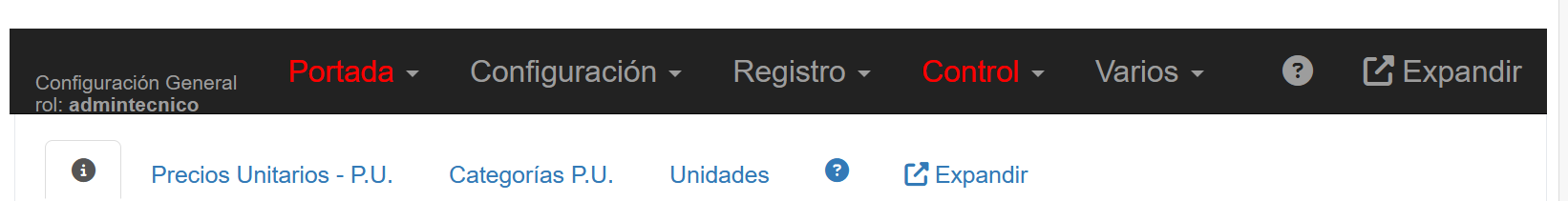 Al seleccionar la opción Configuración 🠊Precios Unitarios, aparecerá una pantalla con una serie de pestañas en segundo nivel tal como se muestra en la figura a continuación .