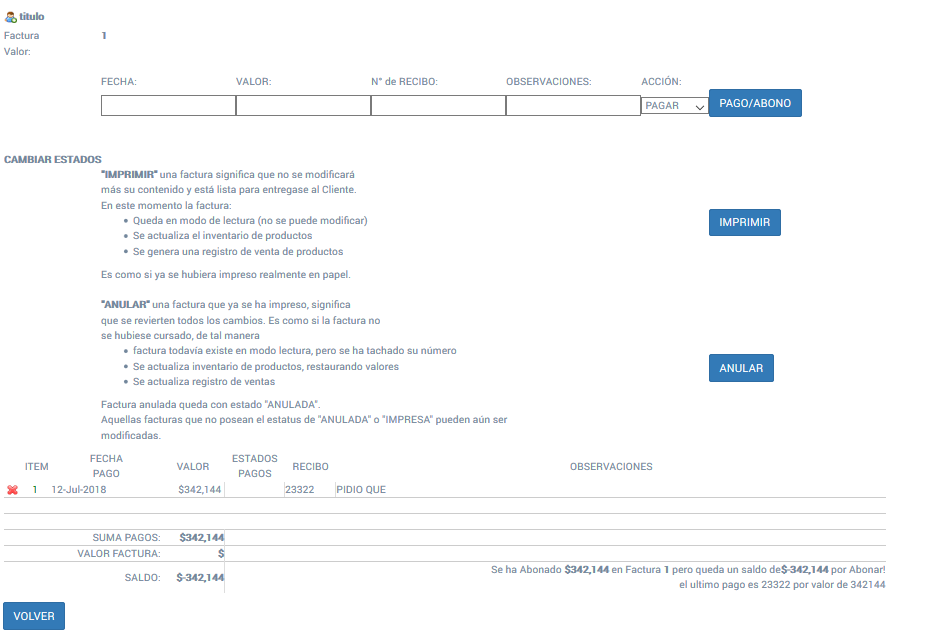 IMPRIMIR Esta acción indica si la factura efectivamente se ha causado (se ha impreso hoja de papel). Al suceder esta situación el estado de la factura cambia a solo lectura ya que no debe ser posible modificarla. Es es éste momento cuando se debe actualizar el INVENTARIO de los productos Afectados.