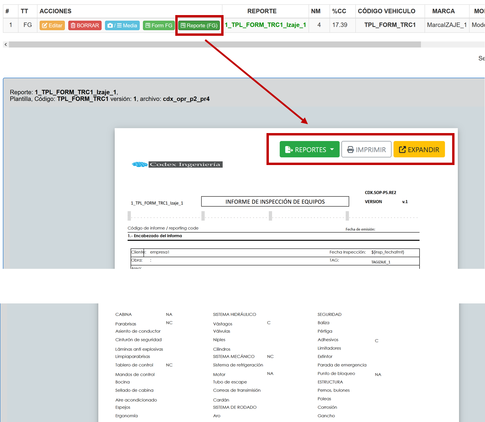 En el modo de Visualización se activa el reporte de inspección vehicular en modo Visualización, es decir ya no se vé un formulario sino que se representa como pagina web con los valores que el formulario tenga.