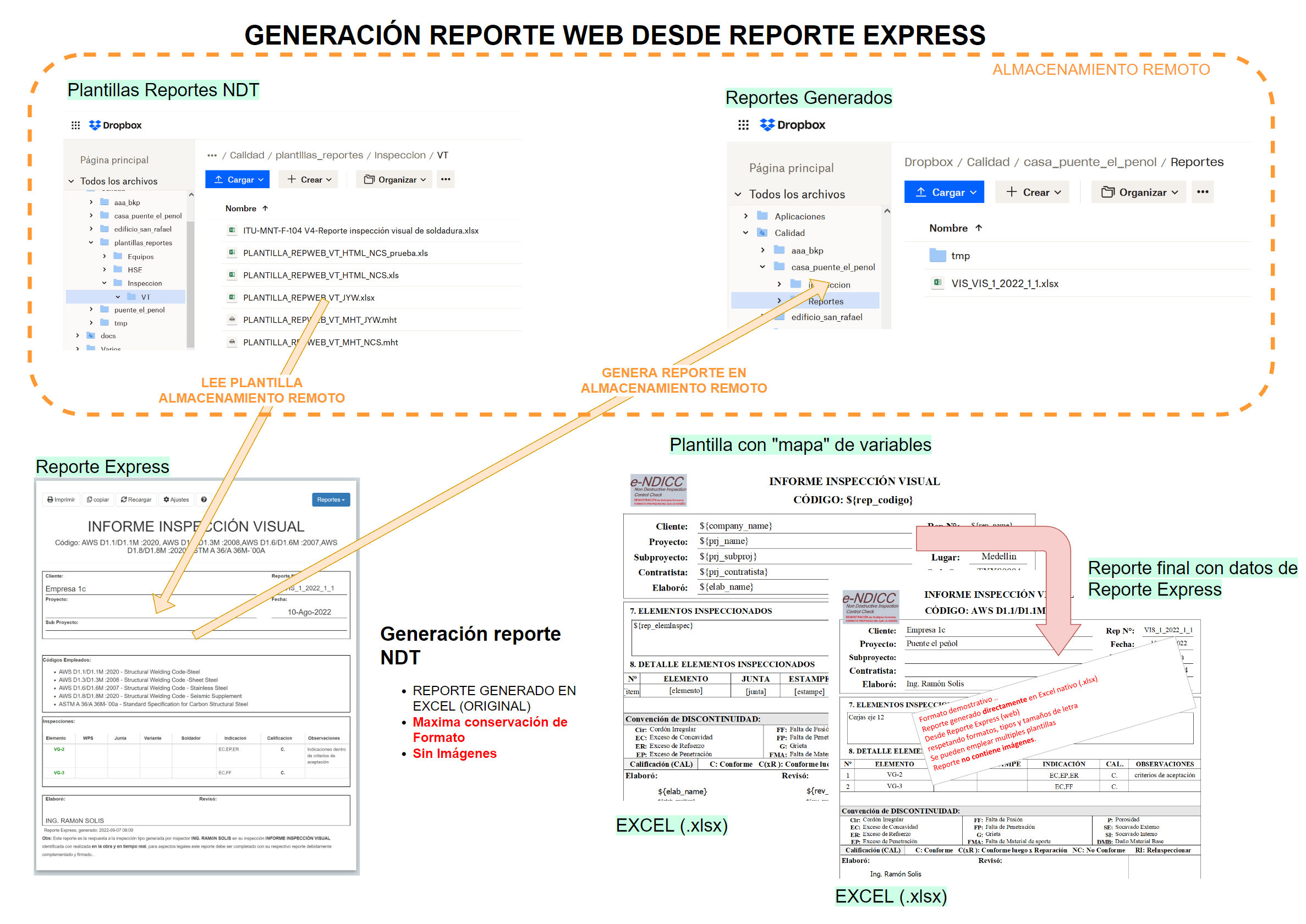 Tanto las plantillas como los reportes generados se encuentran en el medio de almacenamiento remoto. Es necesario definir plantillas por cada tipo de reporte NDI que se emplee