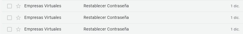 Para el ejemplo actual el valor de SmtpAccountAlias es "Empresas Virtuales" y el asunto "Restablecer Contraseña" por lo que hay que verificar en el sistema de correos aquellos correos que tengan "Empresas Virtuales" como remitente, tal como se muestra en la siguiente imagen.
