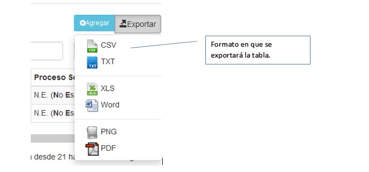 Exportar: Permite guardar el contenido de esta tabla en los formatos desplegados. Al presionar el botón exportar, se despliega una lista con posibles formatos.