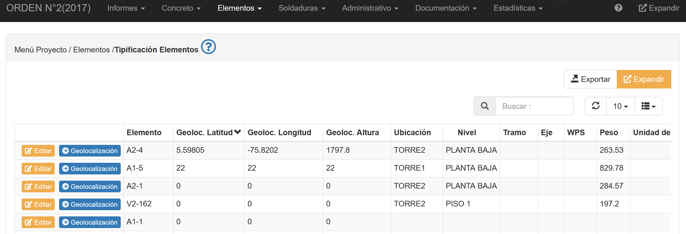 Al seleccionar esta opción se obtendrá un listado de TIPIFICACIÓN DE ELEMENTOS que este proyecto de inspección posee, tal como se muestra en la siguiente imagen.