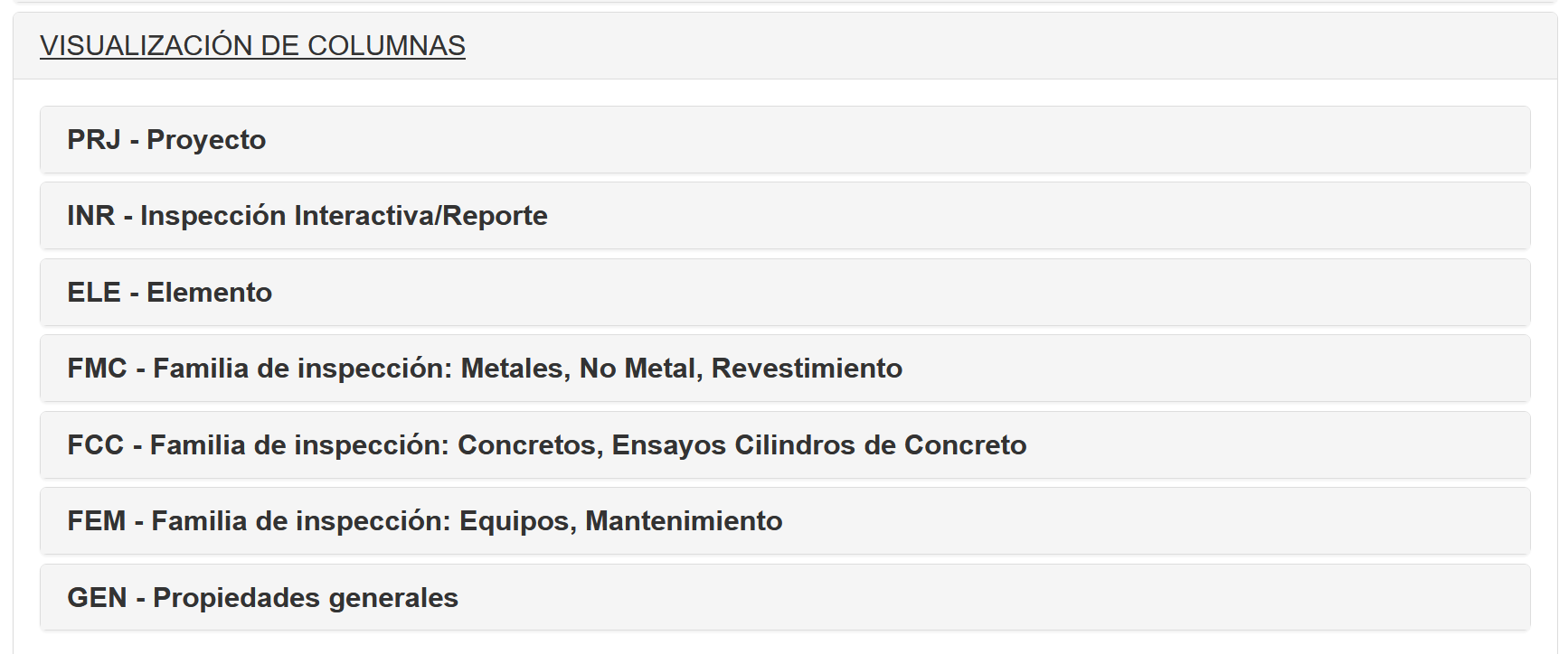 En tablas de datos se representan distintas columnas (que representan atributos de un determinado objeto), las cuales según tipo de proyecto de inspección se activan o no.