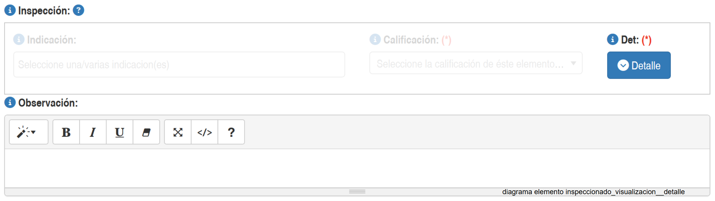 Al activar la opción Detalle un campo para ingresar datos se mostrará en la la ventana para editar/agregar elemento Inspeccionado. Esta opción solamente se activará si en definición de opciones de visualización se activa esta , tal como se muestra en la siguiente imagen