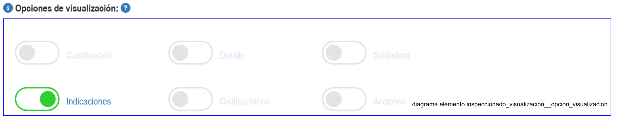 Al activar esta opción, se produce que en la Ventana de agregar/editar de un elemento inspeccionado (ver Agregar/Editar Elemento Inspeccionado) en el recuadro Inspección se activen o no ciertos elementos gráficos que permiten el ingreso de información de la inspección del elemento asociados a mostrar el campo de información para la opción INDICACIONES de la la información. Tal como se muestra a continuación