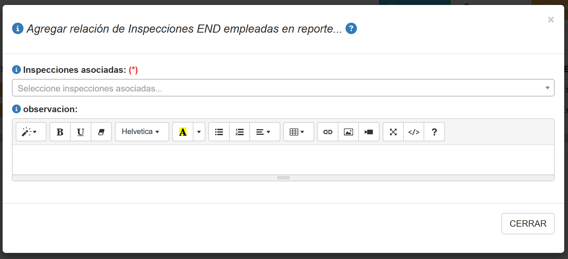 Al presionar el botón Editar/Agregar aparecerá una ventana emergente que permite Editar/Agregar la relación entre un reporte de inspección END definido en el sistema y el reporte actual, tal como se muestra en la ventana a continuación.