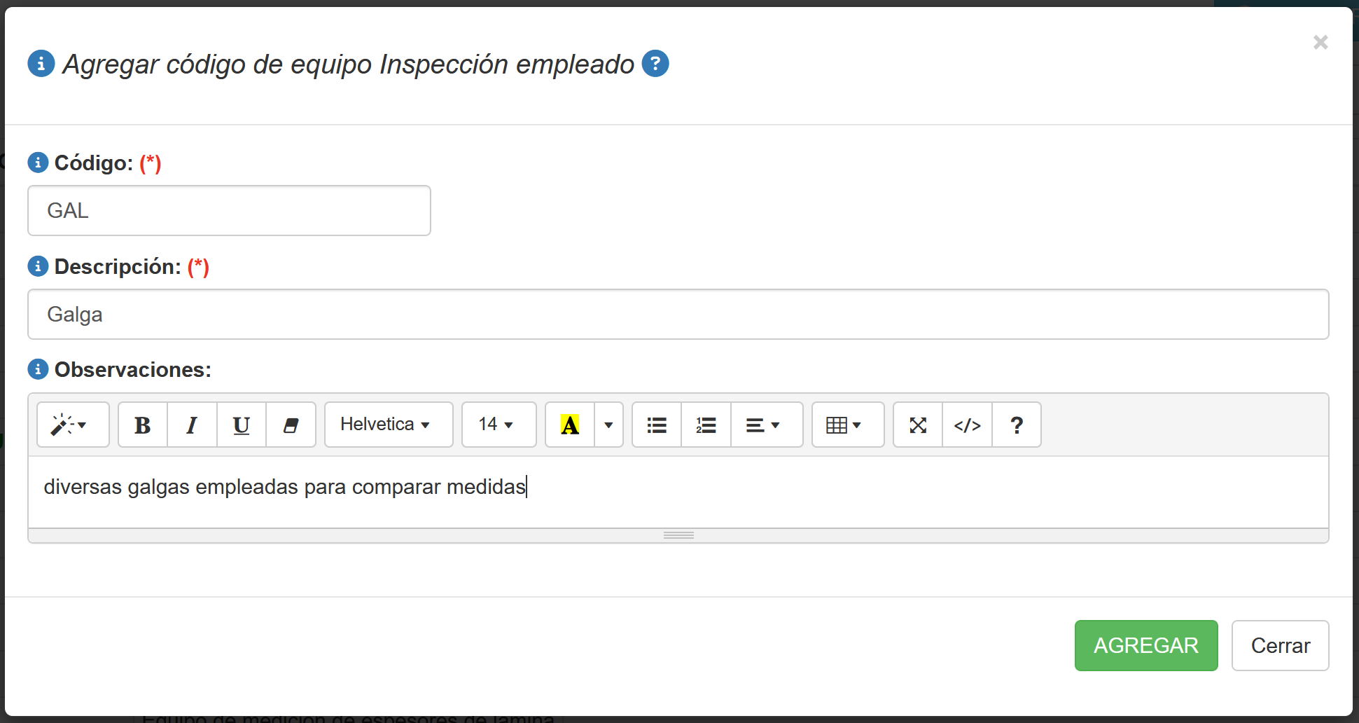 Al presionar el botón Editar/Agregar en la pestaña Código aparecerá una ventana emergente que permite Editar/Agregar un determinado Código de un equipo de inspección. tal como se muestra en la ventana a continuación.