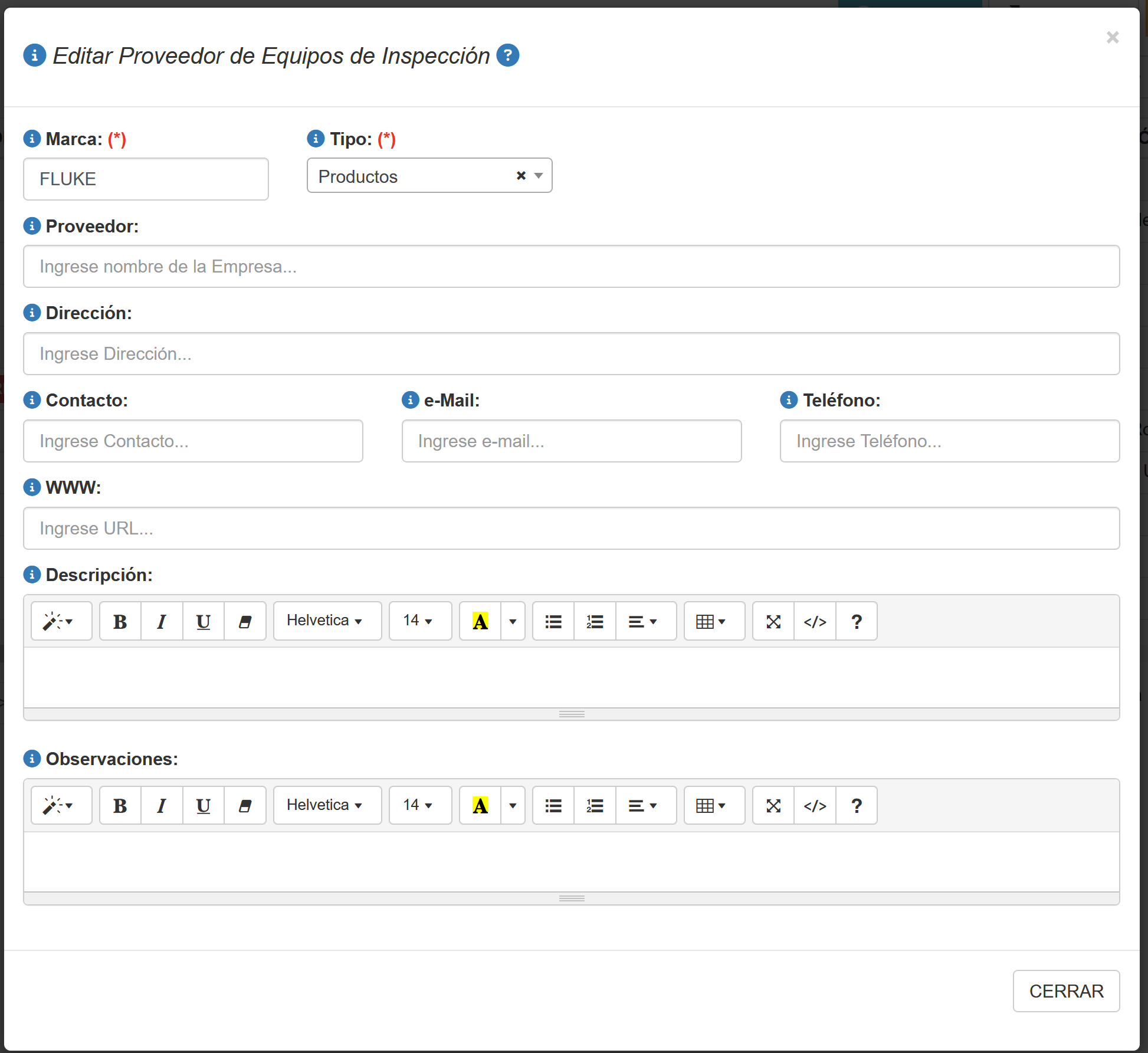 Al presionar el botón Editar/Agregar en la pestaña Proveedor aparecerá una ventana emergente que permite Editar/Agregar un determinado Proveedor de equipos de inspección, tal como se muestra en la ventana a continuación.