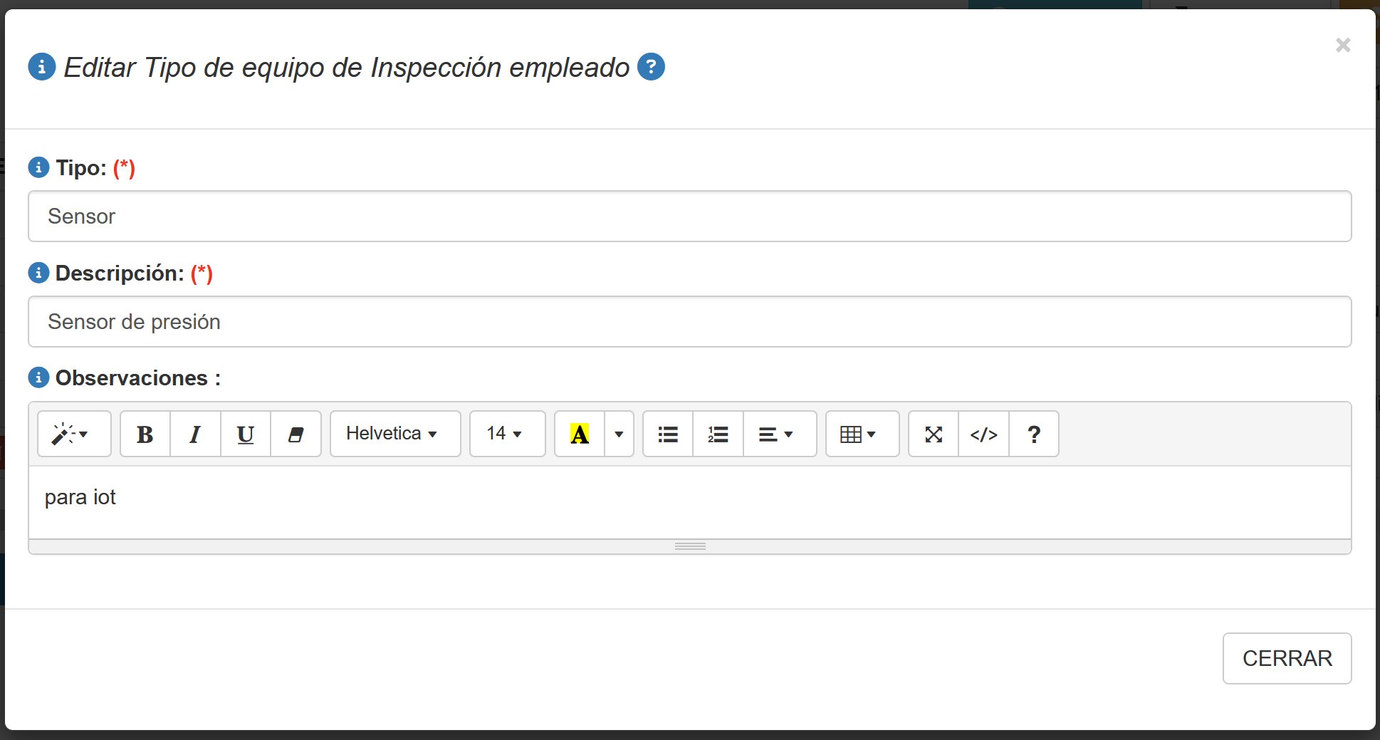Al presionar el botón Editar/Agregar en la pestaña Tipo aparecerá una ventana emergente que permite Editar/Agregar un determinado Tipo de equipo de inspección, tal como se muestra en la ventana a continuación.