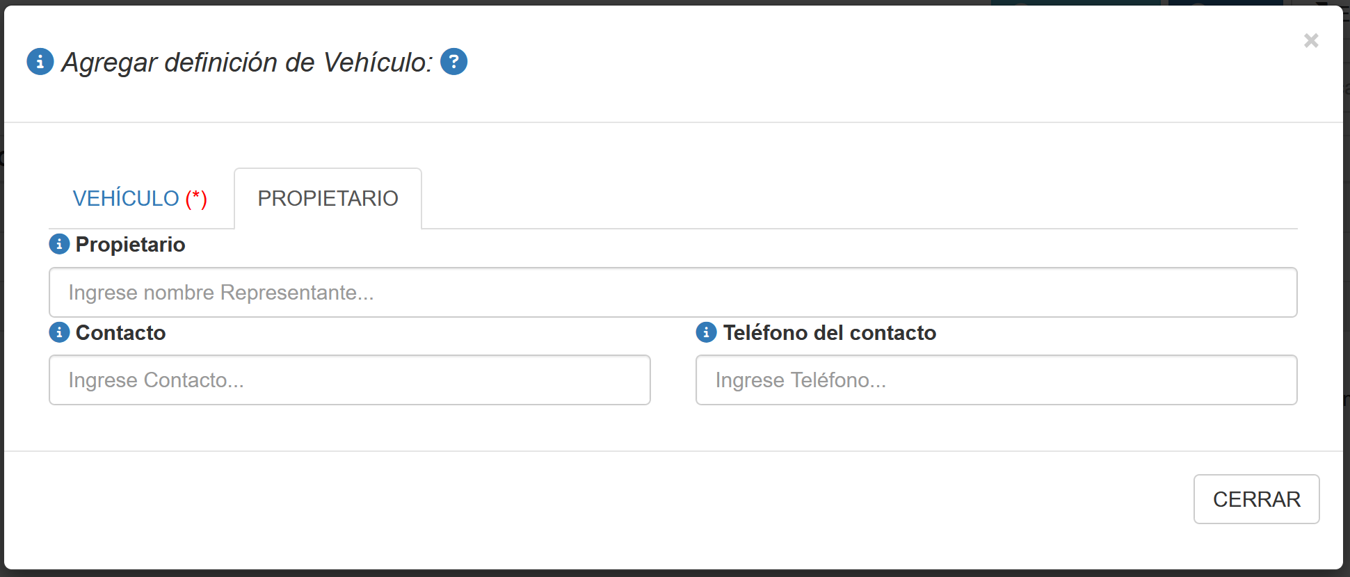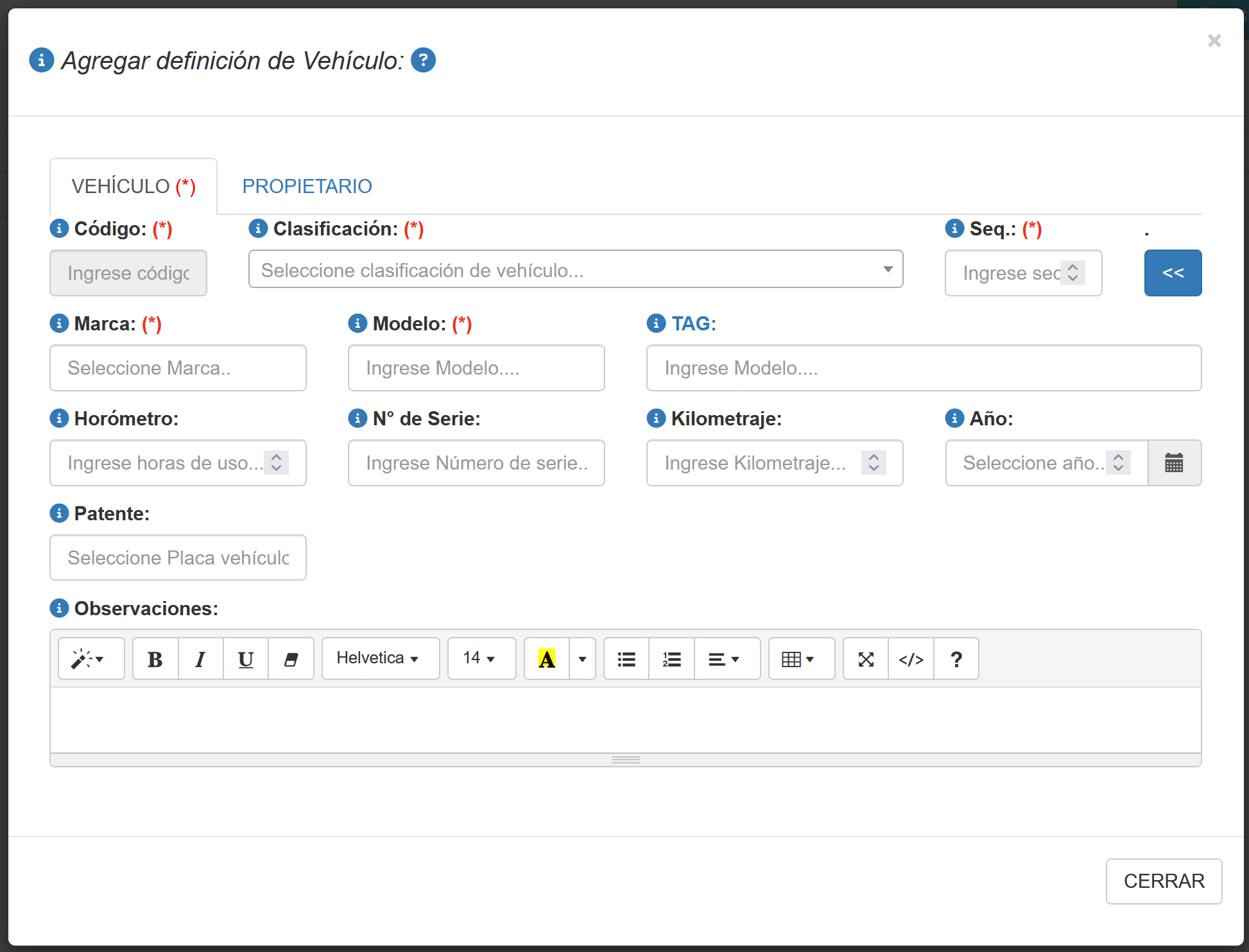 Fig 395 Ventana emergente para agregar/editar definición de Vehículo. Pestaña PROPIETARIO activa.