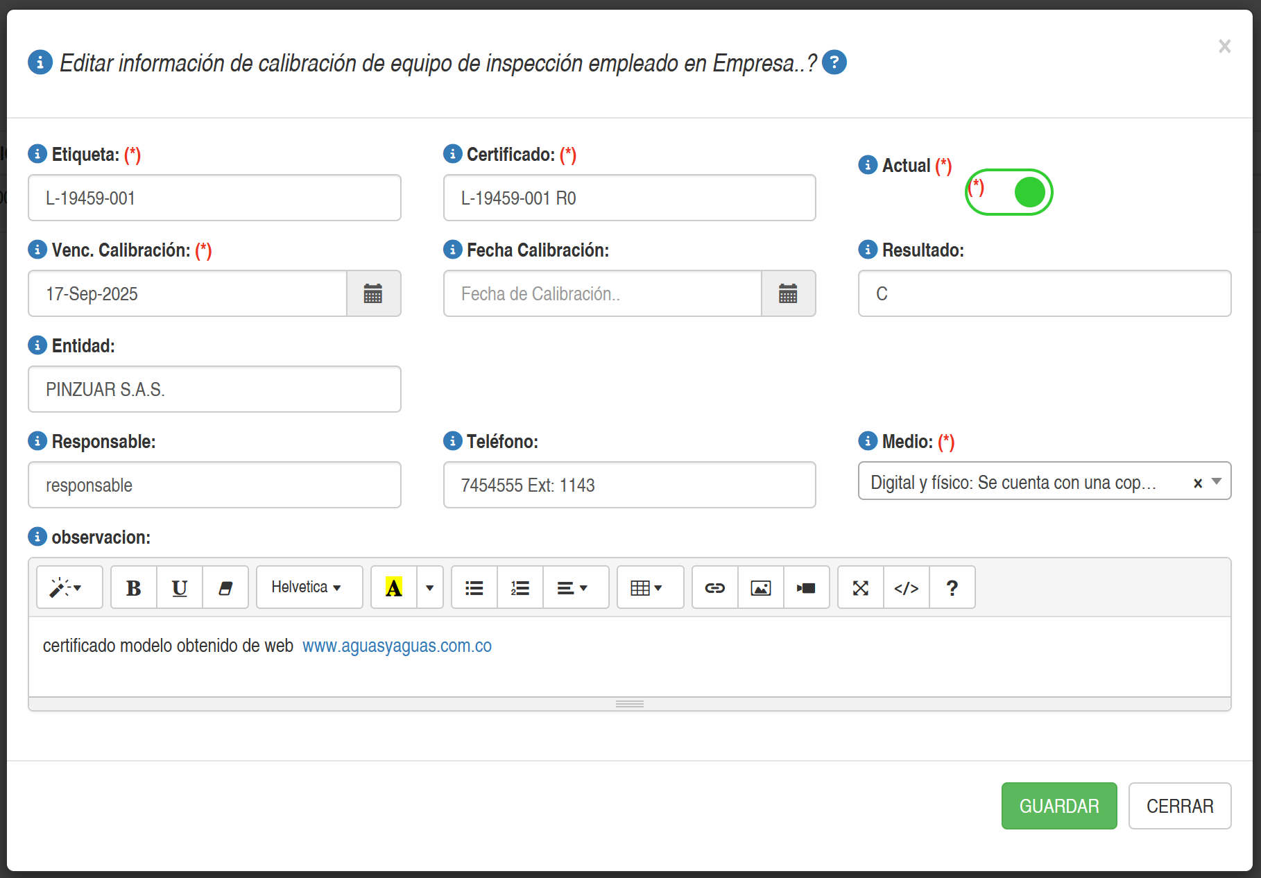Al seleccionar el botón Crear/Editar de la lista de calibraciones de un determinado equipo , aparecerá una ventana emergente con datos para Crear(en blanco) o Editar (con datos de la respectiva fila) tal como se muestra a continuación.