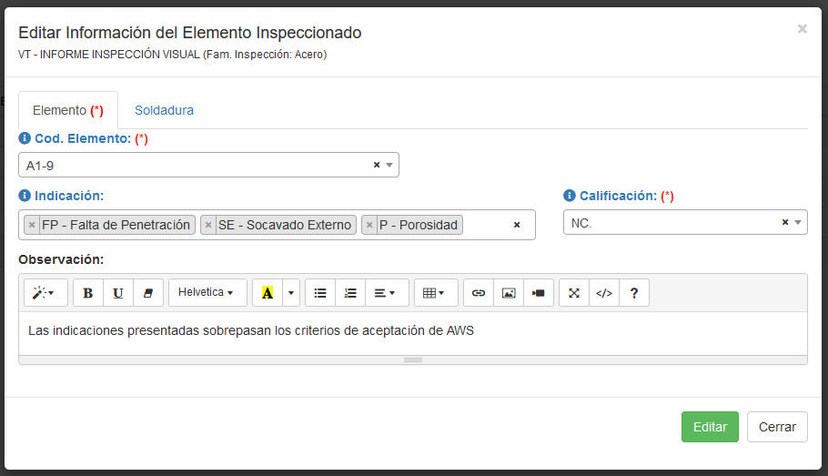 Reportes Personalizados /Tipos de Reportes/Forma de realizar la inspección/Por Elemento/Agregar/Editar