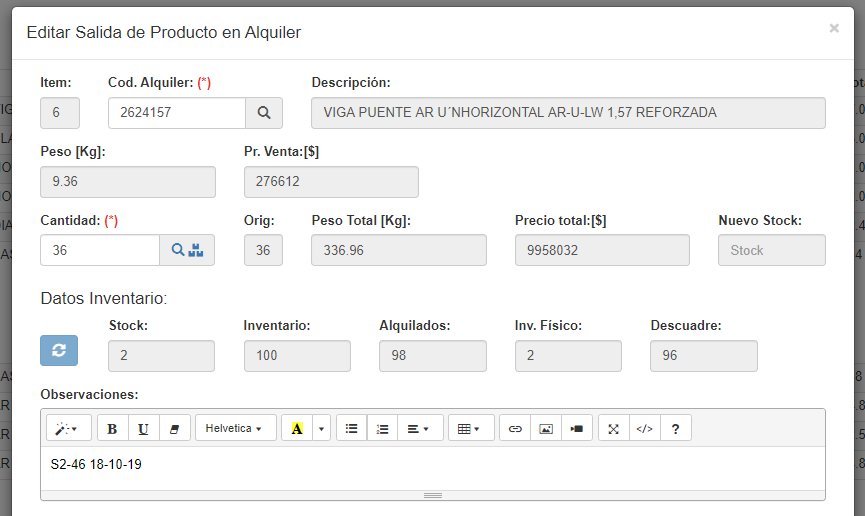 Fig 785 Extracto de Pantalla, ventana emergente para ingresar/modificar datos de producto en Alquiler.