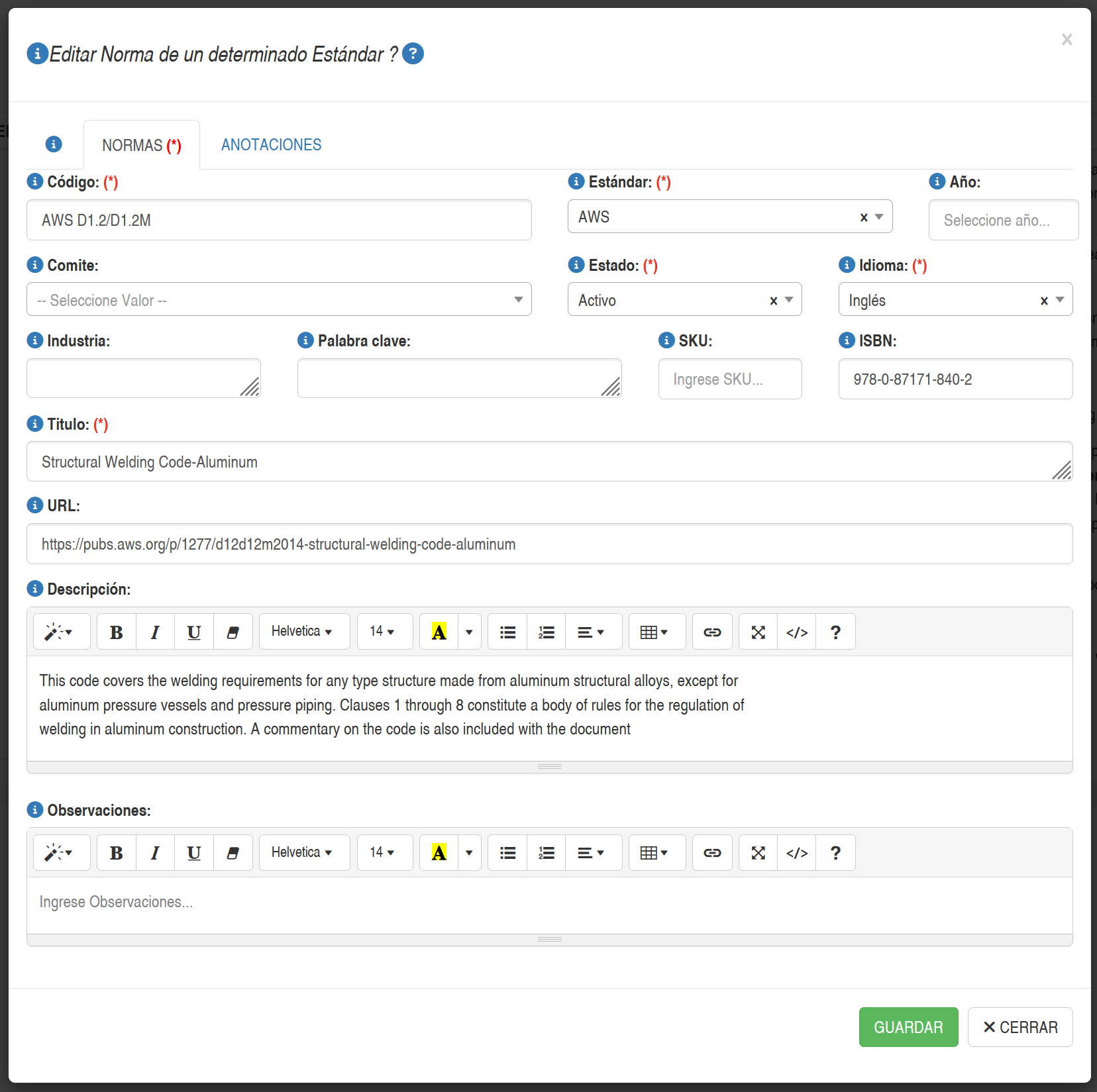 Al presionar el botón agregar/editar se activa una ventana emergente con la opción de agregar/editar información del código o norma en sí. Tal como se muestra en la imagen a continuación.