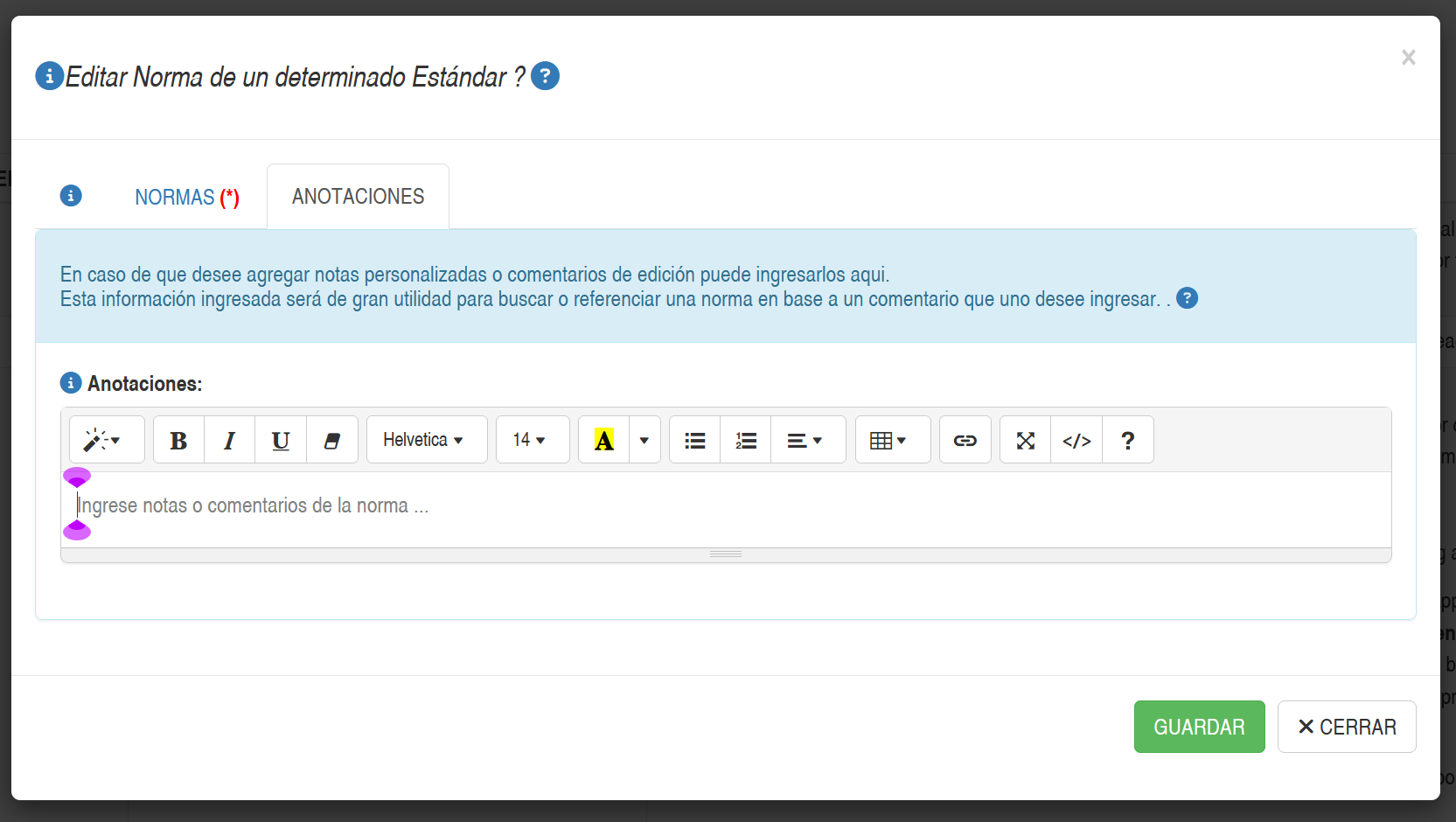 Fig 1376 Extracto de pantalla, con ventana emergente de información para editar/agregar una determinada norma. Pestaña ANOTACIONES seleccionada