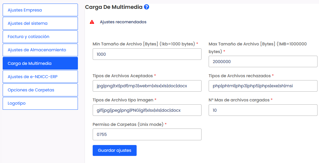 Sistema e-NDICC-ERP/Cuenta Administrador/Configuración/Configuración Empresa/Ajustes de Multimedia