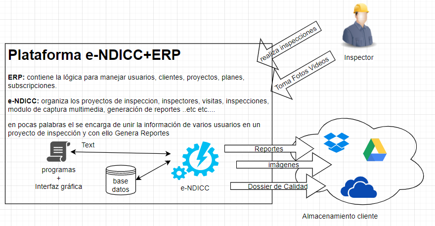 El sistema e-NDICC-ERP es una aplicación Web que contiene que contiene una lógica que permite organizar los proyectos de inspección, las inspecciones, indicaciones etc en una base datos y una serie de elementos gráficos que permiten visualizar adecuadamente esta información