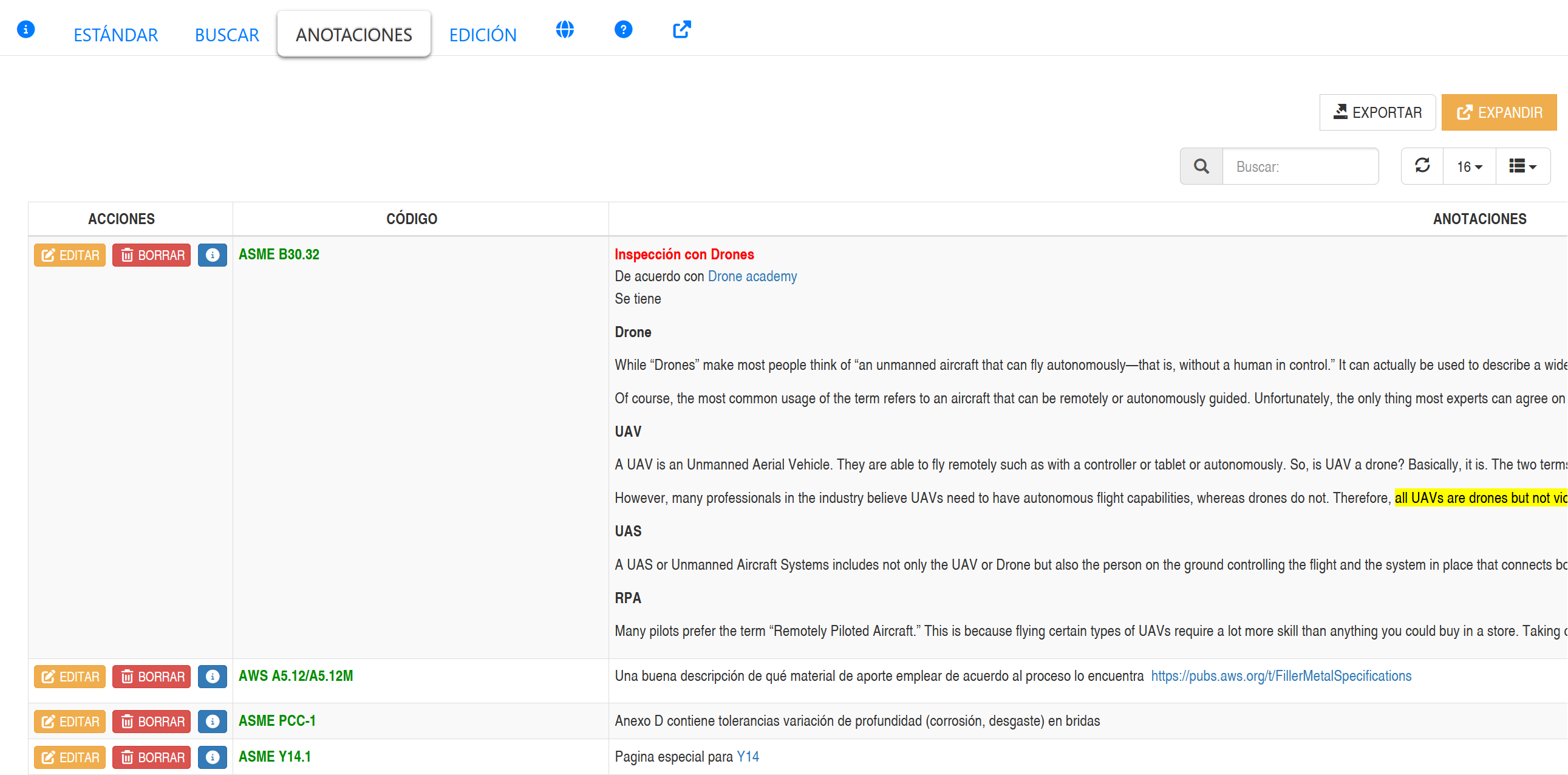 Sistema e-NDICCDocumentación DigitalManejo de Normas Anotaciones Normas Al seleccionar la pestaña ANOTACIONES, se presentará un listado de las anotaciones agregadas las normas, tal como se aprecia en la imagen a continuación. Fig 1389 Extracto de pantalla, mostrando un listado de Anotaciones registradas en normas.