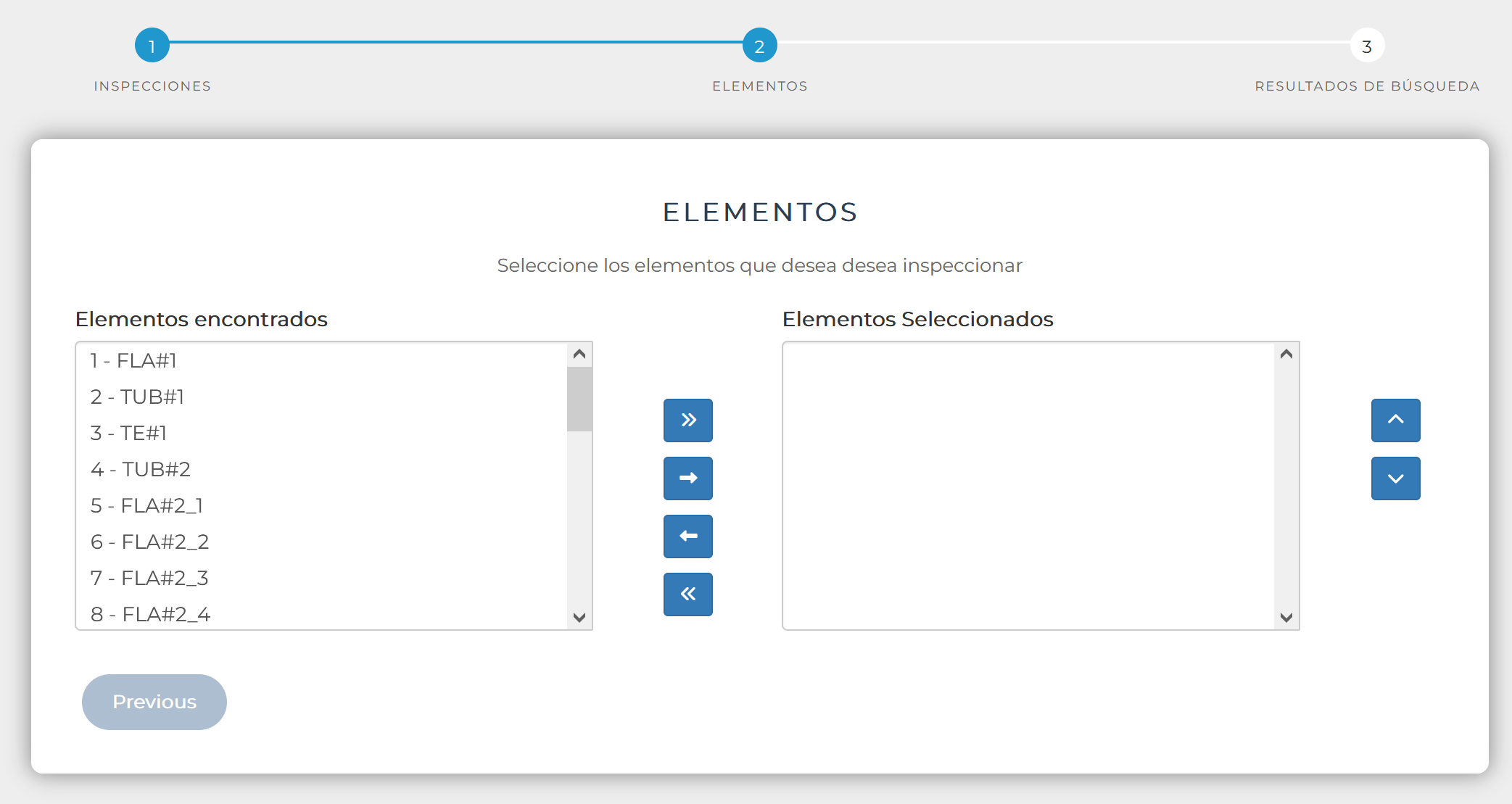 Al seleccionar la pestaña 18 ELEMENTOS, dependiente la pestaña Elementos , se mostrará un asistente de 3 pasos, que permite asignar a un grupo de elementos que serán inspeccionados por una inspección del plan de inspecciones.