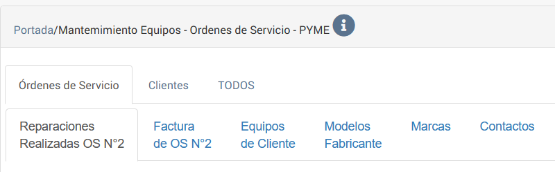 Fig 729 Pestañas de Segundo nivel, relacionadas con la opción de Servicio de la respectiva orden de Servicio seleccionada para una empresa PYME