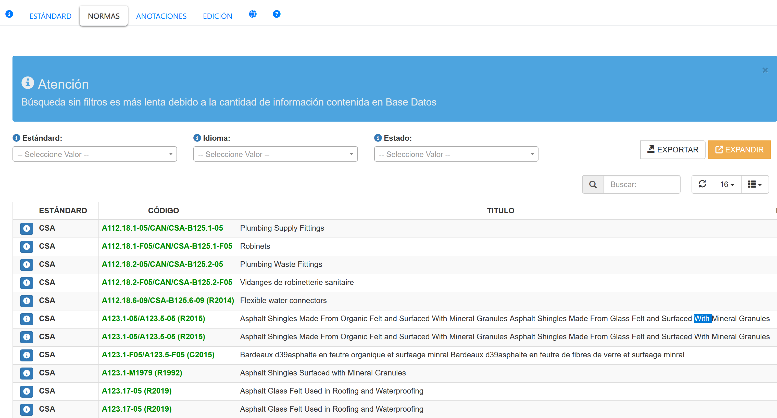 Al seleccionar la pestaña NORMAS, se presentará un listado de todas las normas disponibles sin clasificación, pero con diversos filtros, tal como se aprecia en la imagen a continuación.