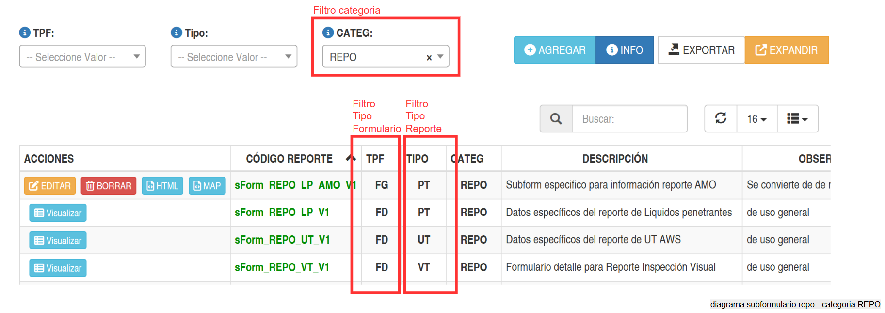 Esto se hace a través la definición de un determinado sub formulario para el tipo de reporte (se emplea su código). Los sub formularios con categoría REPO se pueden visualizar aplicando el filtro "REPO" en la página, tal como se aprecia en esta imagen