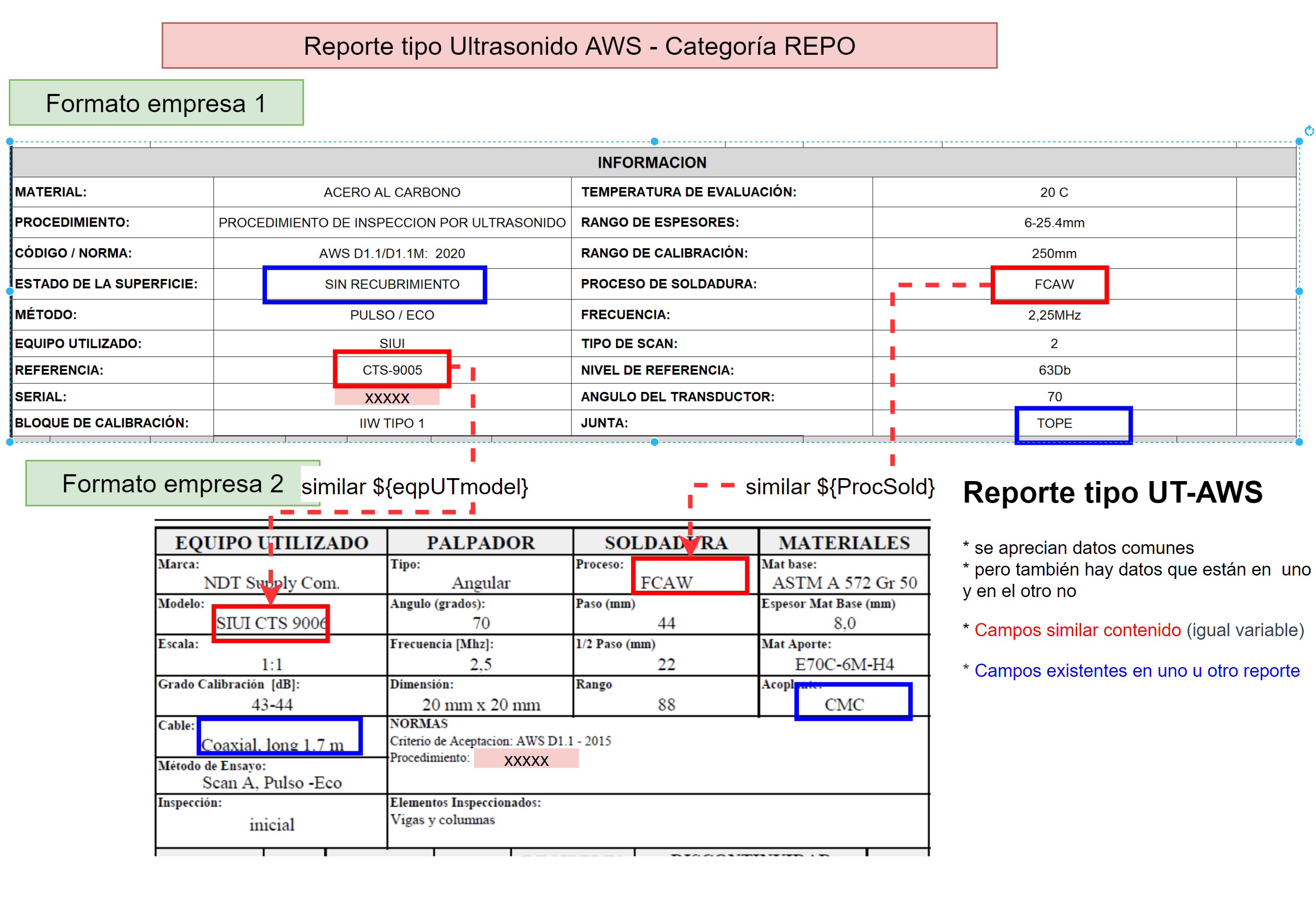 Fig 1188 Comparación extracto de Reporte de Inspección Ultrasonido según AWS de 2 empresas