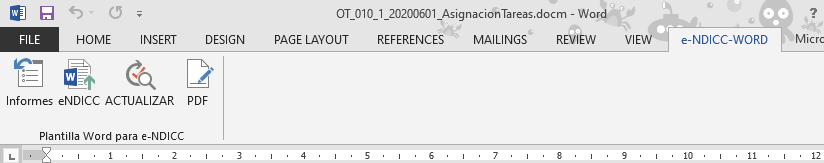 Las Cintas de Menú son una opción de Office que simplifica el proceso de opciones de menús. La cinta de menú propia de e-NDICC se activa en la parte superior al seleccionar "e-NDICC-WORD" y con ello se visualiza en una cinta de menú (Ribbon), tal como se muestra en la siguiente imagen.