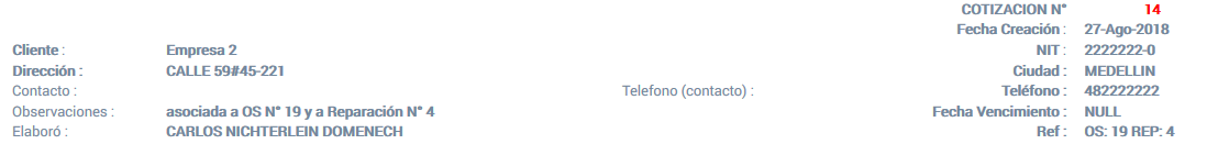 En el caso del encabezado de la cotización, se mostrará la información de la cotización solo a modo texto tipo etiqueta, tal como se muestra en la siguiente figura