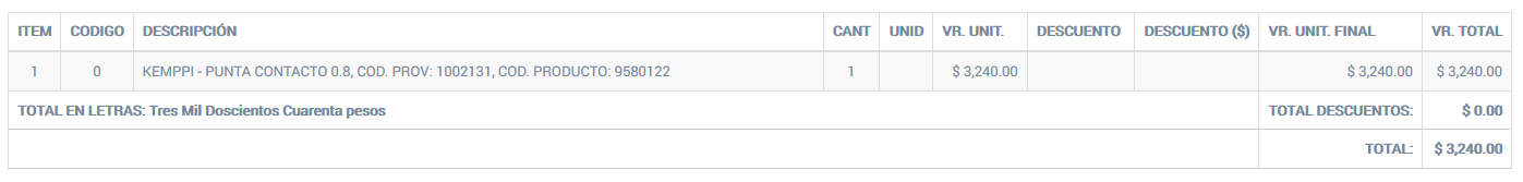 En el caso del detalle de la cotización, solamente se mostrará un listado de los items sin posibilidad de manipular los datos ya que no están los botones de control activos.